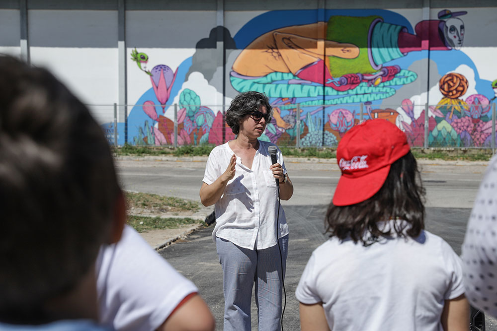 Carla Guerreiro, que tem os pelouros do Ambiente e da Educação, falou a alguns estudantes durante a inauguração de um mural pintado por Gonçalo Mar na parede das traseiras do pavilhão gimnodesportivo da EB Barbosa du Bocage, que, tendo como tema a mobilidade sustentável, conclui um projeto municipal, com fundos comunitários, de comunicação e sensibilização em cenários de risco associados às alterações climáticas.