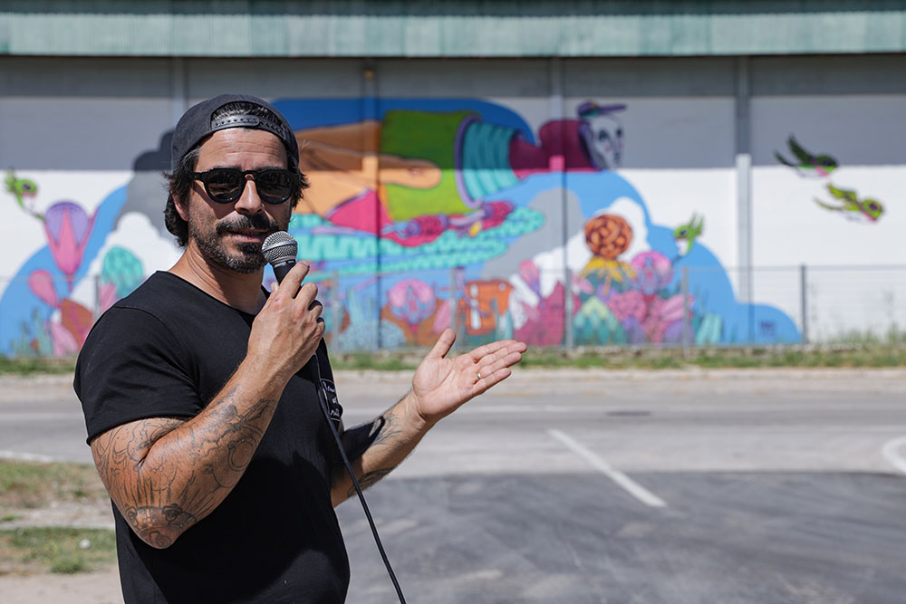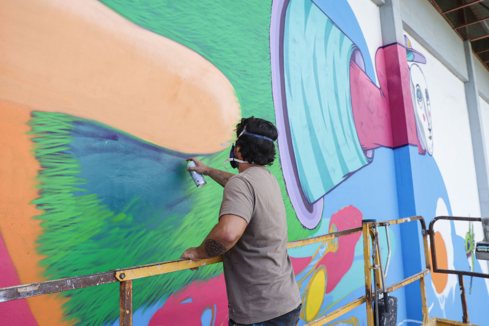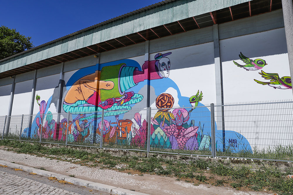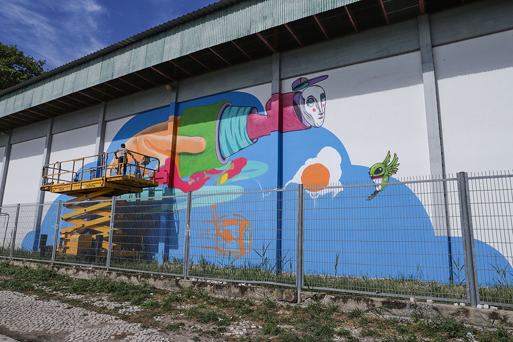 Gonçalo Mar demorou seis dias e usou cerca de 50 latas de tinta em spray para pintar um mural surrealista que conjuga a natureza com a mobilidade sustentável, para, como afirmou, fazer “pensar na pegada ambiental da espécie humana”, que é “a única que consegue criar mudanças no próprio planeta”.