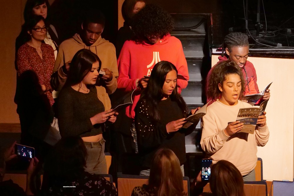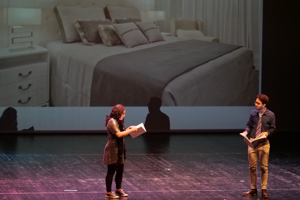 O espetáculo multidisciplinar prosseguiu com a apresentação “Descobrir o teatro com: Karl Valentim”, através da leitura dos poemas “Ida ao Teatro” e “Casa para vender”, por alunas da Escola Secundária du Bocage.