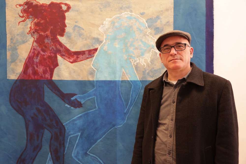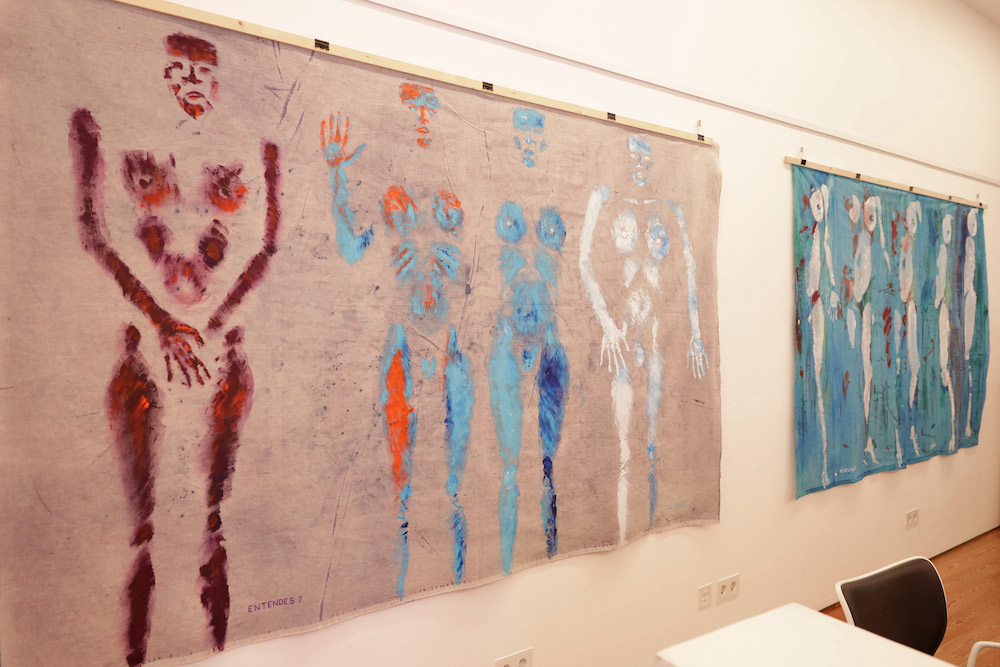 Em “Olha para mim”, o artista explora a figuração humana através de técnicas pouco convencionais. “Estes trabalhos são feitos com as modelas deitadas no tecido e depois, a partir do contorno que é desenhado no próprio tecido, fica feito um registo inicial.”