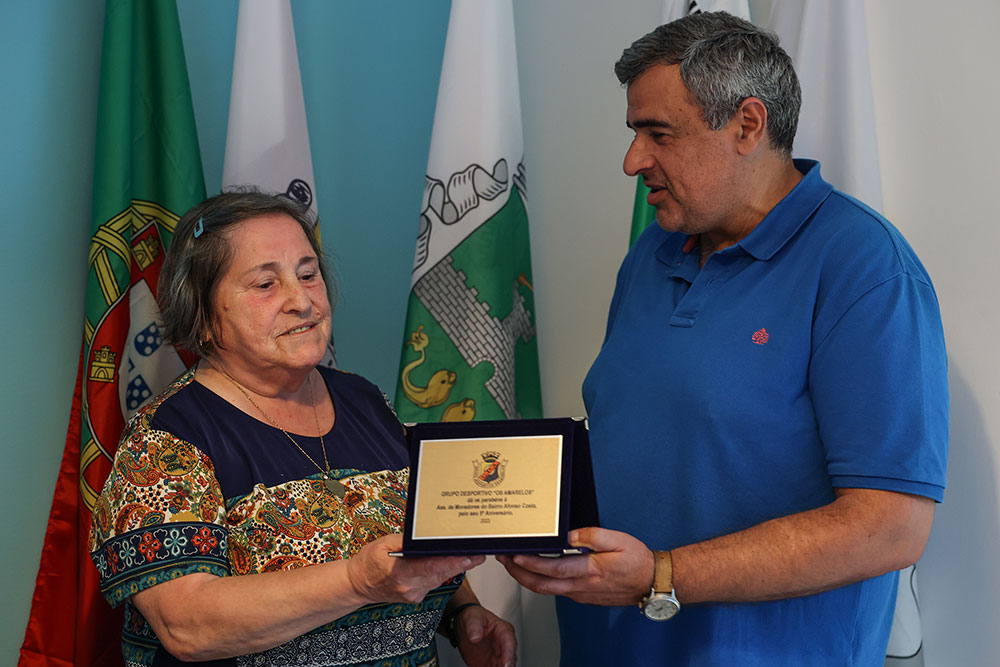 A sessão solene comemorativa do quinto aniversário da Associação de Moradores do Bairro Afonso Costa contemplou a entrega de lembranças pelas autarquias e coletividades presentes e terminou com bolo de aniversário e Moscatel de Setúbal.