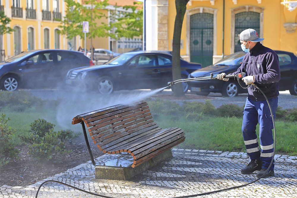 A equipas, continuam, igualmente, a executar a limpeza com máquinas de jato e pressão e recurso a água e hipoclorito de sódio na limpeza do mobiliário urbano, e devidamente equipadas com máscaras e outros equipamentos de proteção individual.
