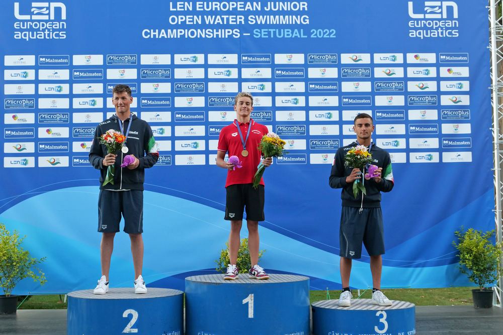 Na manhã do dia 4, o turco Emir Albayrak e a alemã Julia Ackermann venceram as distâncias de cinco quilómetros, que abriram o programa desta competição inédita em Portugal, denominada LEN European Junior Open Water Championships. Mais de quatro dezenas de nadadores, de 14 e 15 anos, participaram na prova, realizada a partir do Parque Urbano de Albarquel.