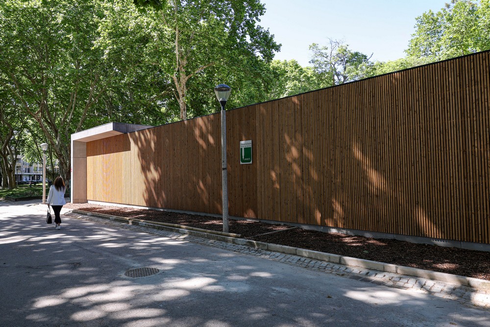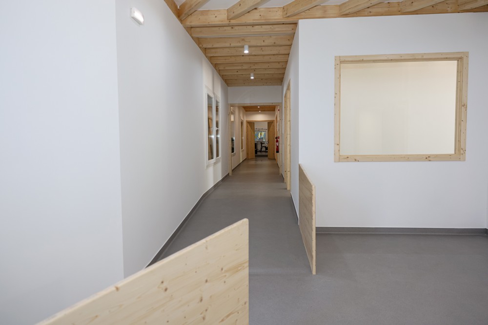 O novo edifício tem as paredes exteriores em madeira maciça tratada com revestimento exterior em ripado de madeira e as paredes interiores em madeira maciça com isolamento térmico e acústico e acabamento em aglomerado de madeira.