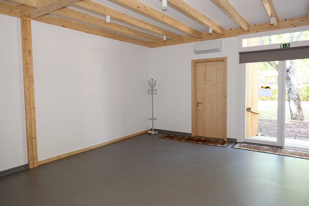 O acesso ao edifício, com quatro divisões, destinadas a entrada, secretaria, direção e arrumos, inclui rampas interiores e exteriores em madeira lamelada colada, adaptadas a pessoas com mobilidade reduzida, no primeiro caso com revestimento em pavimento vinílico e no segundo em deck de pinho tratado.