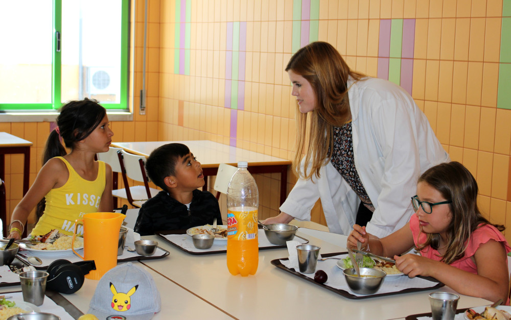 Já nas mesas, onde o grupo de mais de 30 jovens é acompanhado por cinco monitores do Campo de Férias, as técnicas incentivam ao consumo da refeição completa que inclui sempre sopa, segundo prato e sobremesa composta apenas uma vez por semana por um doce, havendo sempre a opção de fruta. A bebida preferencial é água, embora também esteja disponível uma garrafa de sumo por mesa.