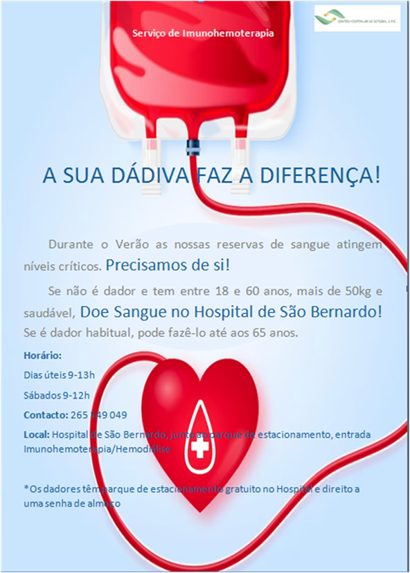 O Centro Hospitalar de Setúbal, através do Serviço de Imunohemoterapia, está a apelar à dádiva de sangue com o objetivo de restabelecer as reservas existentes, que se encontram em níveis críticos.