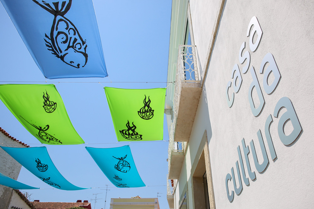 Peixes, alforrecas e algas marinhas sob um fundo azul e verde ondulam agora no céu da Rua Detrás da Guarda, na qual está montado o palco de apoio aos eventos promovidos pela Casa da Cultura.