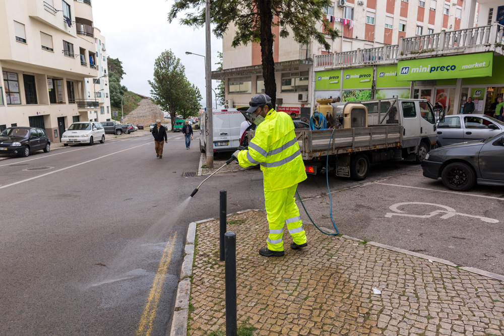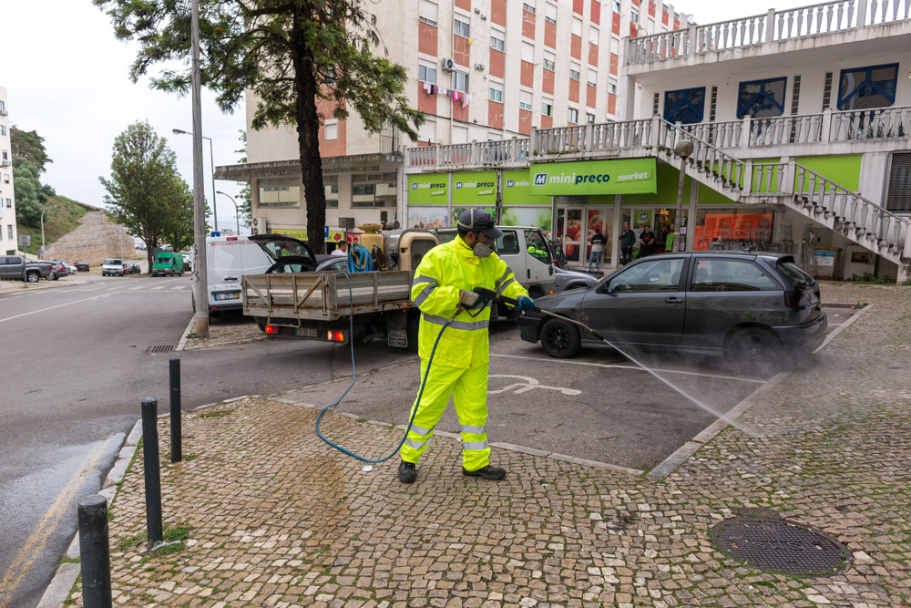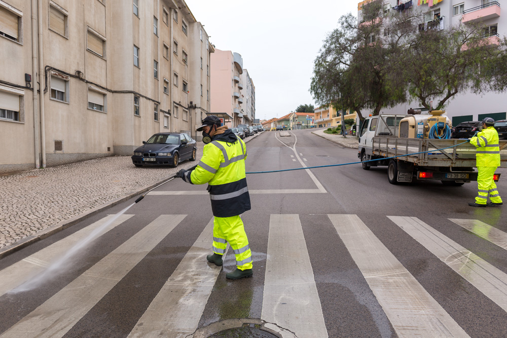 Diversas equipas da Câmara Municipal de Setúbal, responsáveis por uma megaoperação que tem redobrado a limpeza do concelho, reforçaram, no dia 8, a desinfeção de várias ruas, prédios, casas e lojas onde se verifica circulação permanente de pessoas.