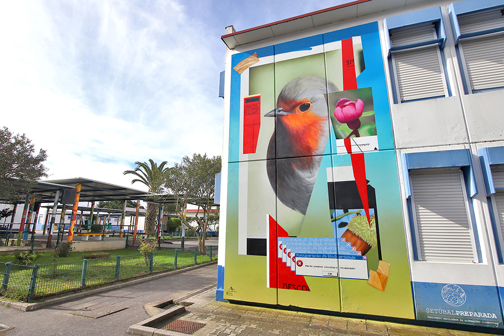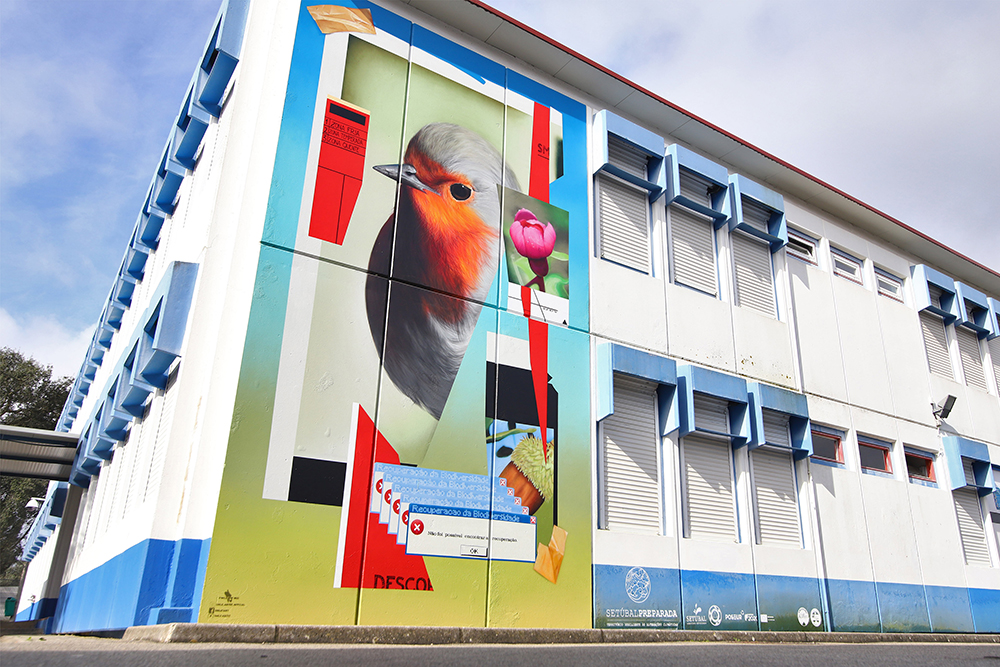 A obra, da autoria de Smile, nome artístico de Ivo Santos, apresenta como elemento central o pisco-de-peito-ruivo, uma das espécies mais emblemáticas do concelho de Setúbal.