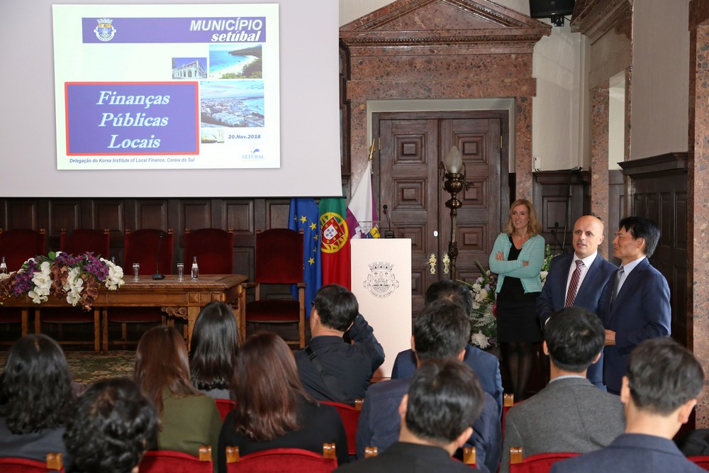 A comitiva sul-coreana, recebida no Salão Nobre dos Paços do Concelho pela presidente da Câmara Municipal de Setúbal, Maria das Dores Meira, e pelos vereadores Pedro Pina, Ricardo Oliveira e Eugénia Silveira, assistiu a uma apresentação sobre as finanças públicas do município setubalense.