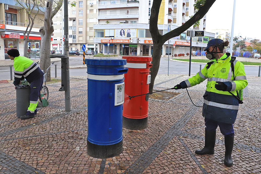 Noutra zona da cidade, uma outra brigada da Câmara Municipal, constituída por quatro cantoneiros, com aplicadores de desinfetante à base de hipoclorito de sódio nas costas, foi destacada para a lavagem da Avenida Jaime Cortesão e das ruas Camilo Castelo Branco, Formosa e General Gomes Freire.