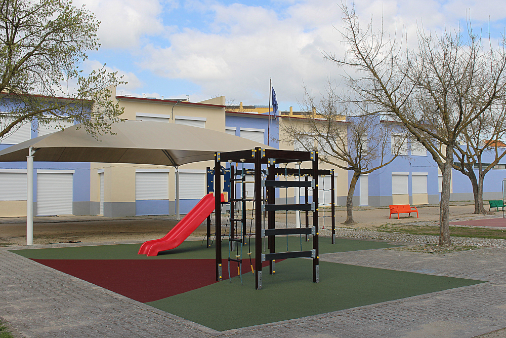 A requalificação do equipamento de jogo e recreio incluiu a remoção integral das placas do pavimento amortecedor, o nivelamento e preparação do piso com argamassas e betonilha específicas e a aplicação do novo piso, conferindo melhores condições de segurança e conforto àquele espaço lúdico.