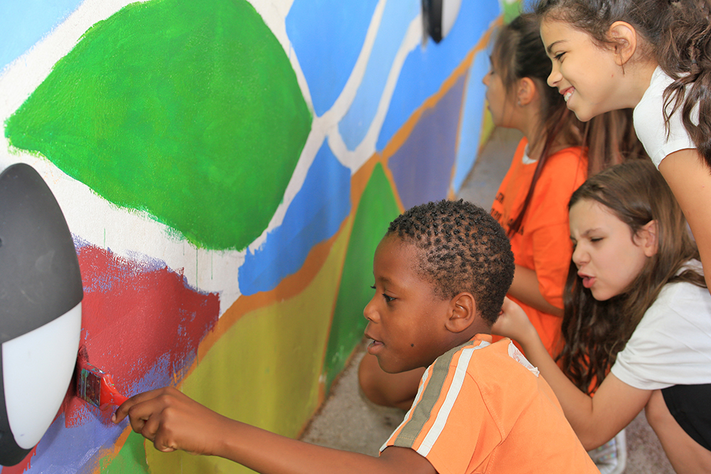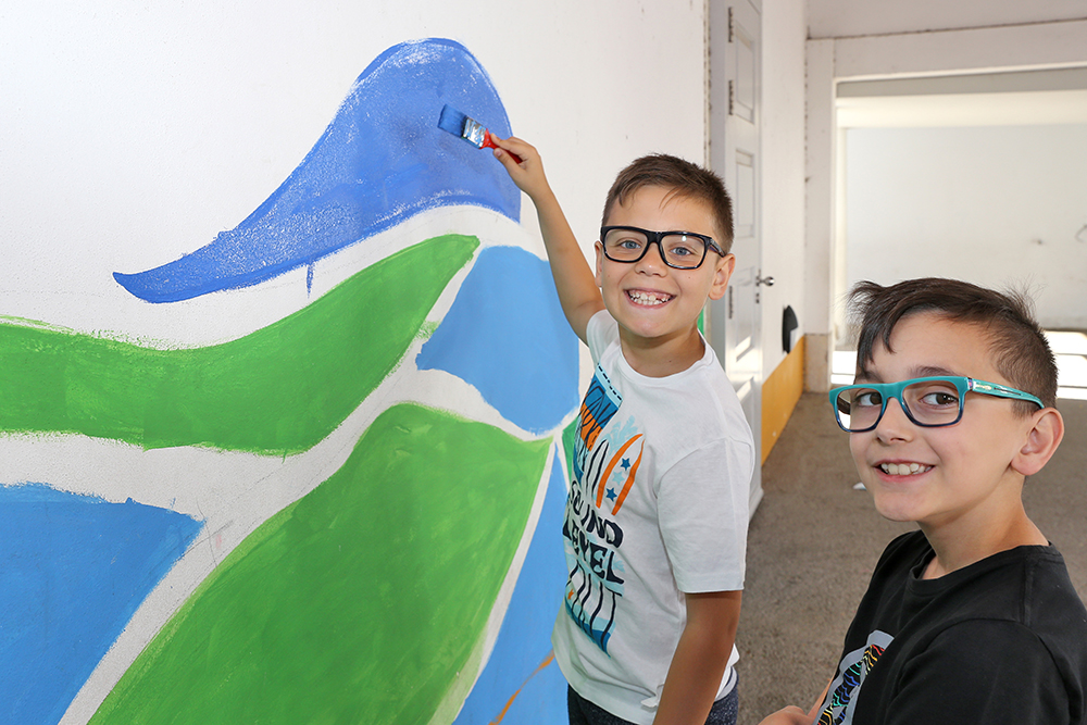 “Este mural representa alegria, simpatia e coisas alegres. Gosto muito de participar nestas atividades e em casa também gosto de pintar”, afirma Guilherme, da turma B do terceiro ano, sem tirar os olhos do pincel, enquanto preenche o desenho de mais uma onda.