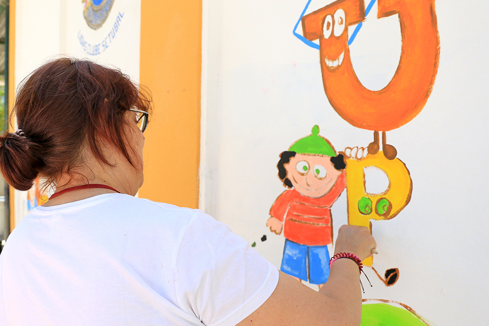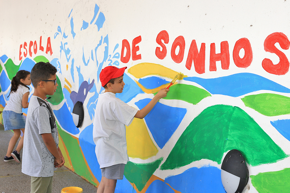 Do outro lado do recreio, a animação e o movimento denuncia a presença de mais alunos. Outras pinturas, estas mais elaboradas, estão em curso. Na parede, o slogan “Escola de Sonhos”, foi o chavão para um mar de cores que deambulam entre o azul do rio Sado e o verde da Serra da Arrábida. Também são percetíveis contornos de golfinhos ainda por colorir.