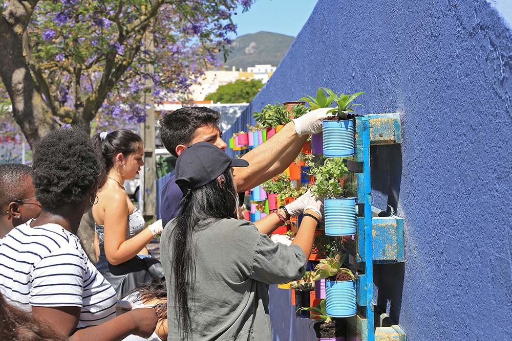 Ao mesmo tempo, na Escola Profissional Cristóvão Colombo – Polo de Setúbal, 45 jovens, com idades entre os 15 e os 21 anos, constroem um jardim de parede com latas de feijão que recolheram e reciclaram, agora colocadas numa parede a servir de vasos com plantas e ervas aromáticas.
