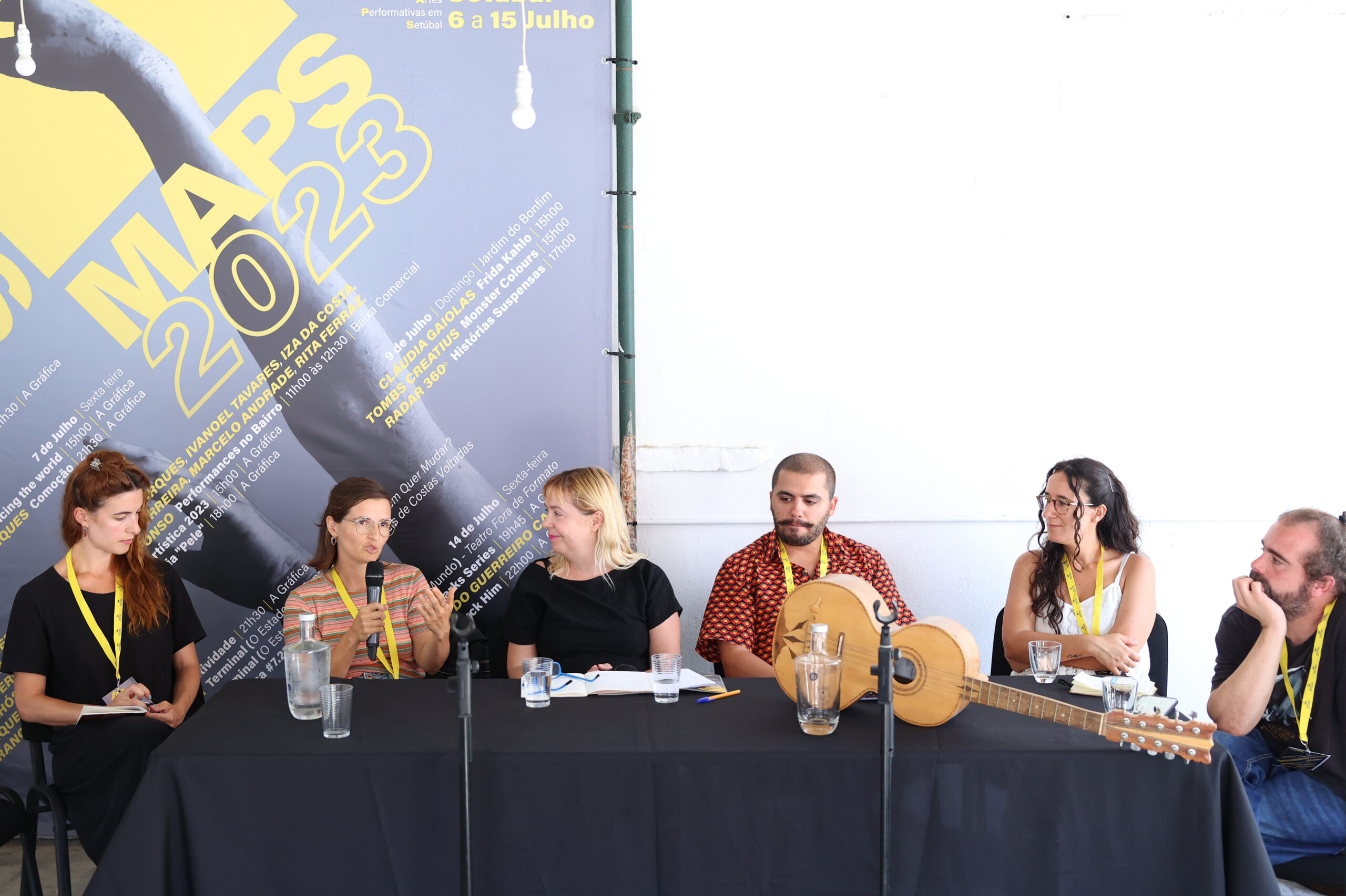 À tarde, no espaço A Gráfica, os vencedores da terceira edição das Bolsas de Criação Artística de Setúbal, Bruno Senune e Beatriz Valentim, Catarina Vieira e Pedro Banza, conversaram com o público sobre os trabalhos selecionados pelo projeto municipal em 2023.