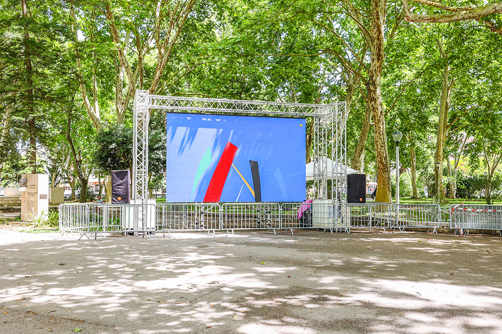 O ecrã de grandes dimensões, com oito metros de largura por cinco de altura, é instalado diariamente numa zona central do Jardim do Bonfim, junto do espaço comercial instalado no Edifício do Lago, na qual são disponibilizados pontos de venda de comidas e bebidas.