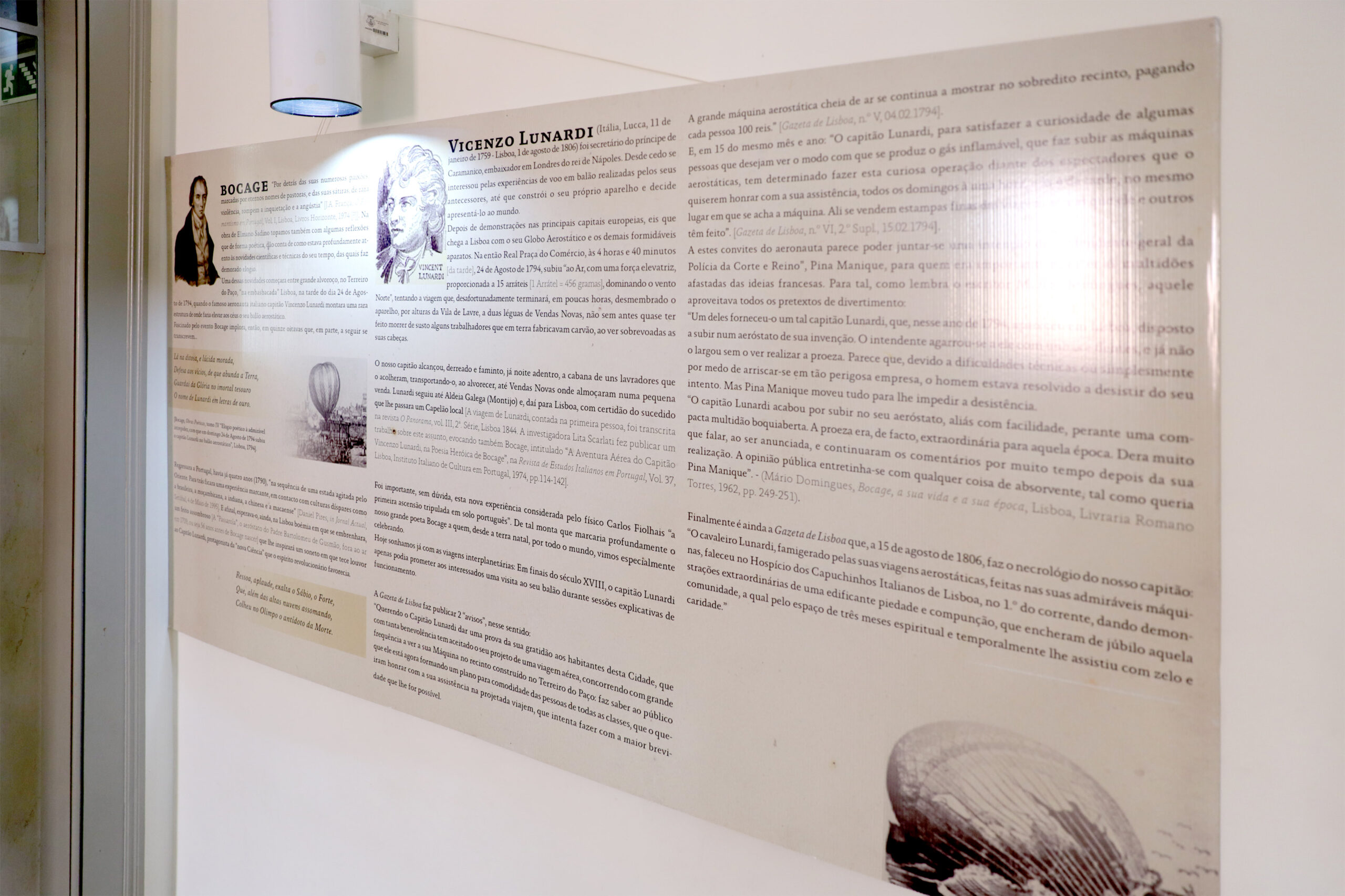 Trata-se da viagem em balão de Vincenzo Lunardi em 1794 com partida do Terreiro do Paço, em Lisboa, um acontecimento para a época, que levou Bocage a escrever um poema de elogio ao militar e inventor italiano e à ciência, o qual pode ser lido num dos painéis em exposição.