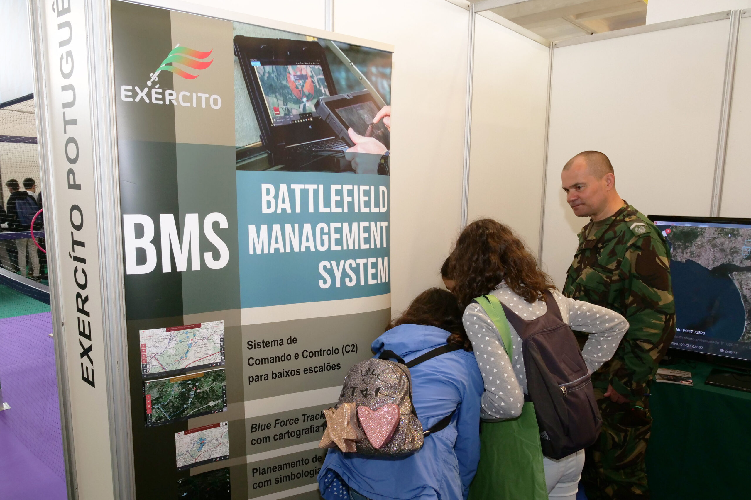 No expositor do Exército, três amigas ouvem as explicações do sargento-chefe Cruz sobre o BMS – Battlefield Management System, que “permite a uma força saber em permanência a localização das viaturas e dos homens”.