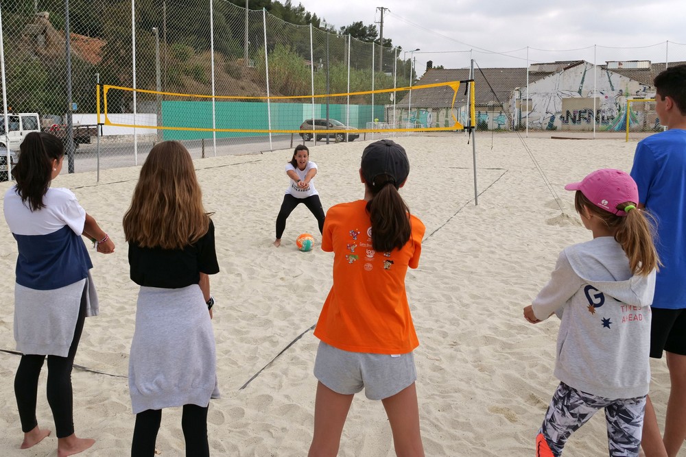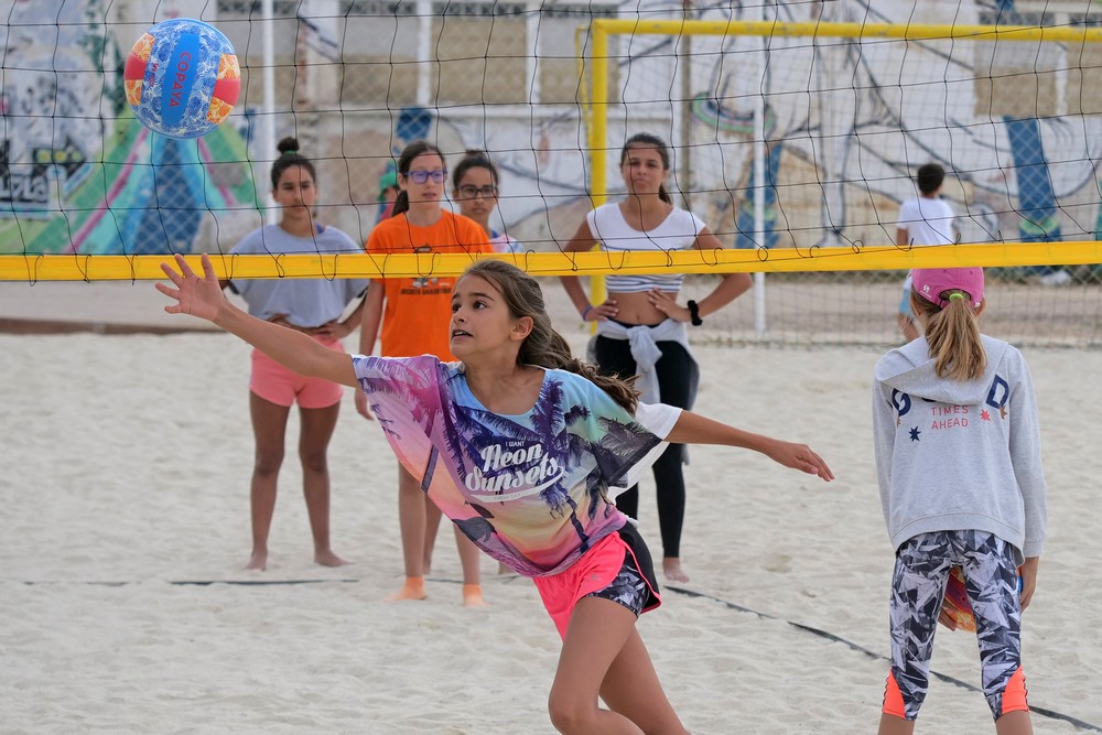 Ali ao lado, no campo de voleibol do Parque Urbano de Albarquel, Carolina Lopes pergunta a 13 crianças e jovens, entre os 6 e os 18 anos, se sabem o que é a “manchete”.