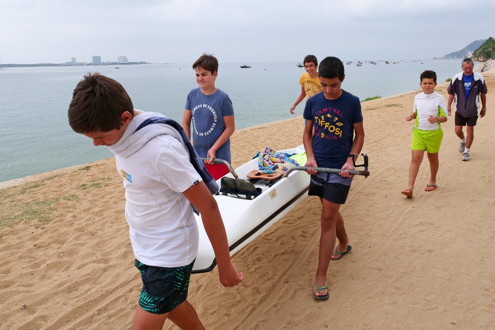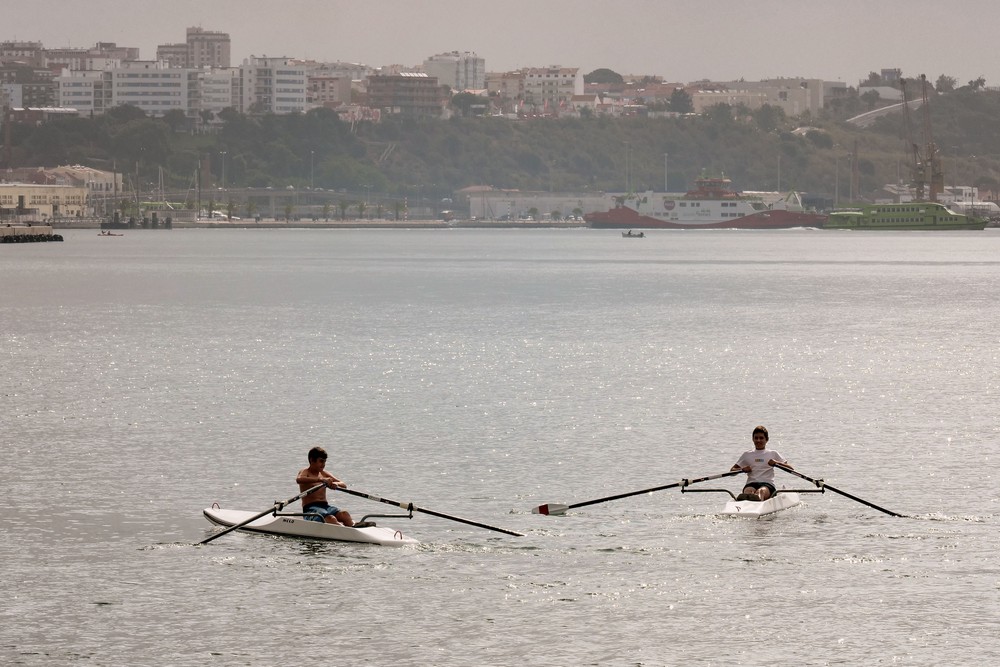 O monitor anui e os rapazes colocam os remos nas embarcações para que Gaspar e Gonçalo Brito façam a primeira saída do dia.