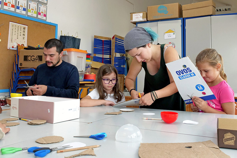 Na fábrica dos brinquedos, na EB do Viso, Sara Rodrigues e Flávio, da Ágora Creators, ajuda um grupo de sete raparigas, entre os 6 e os 14 anos, a construir uma boneca sempre em pé.
