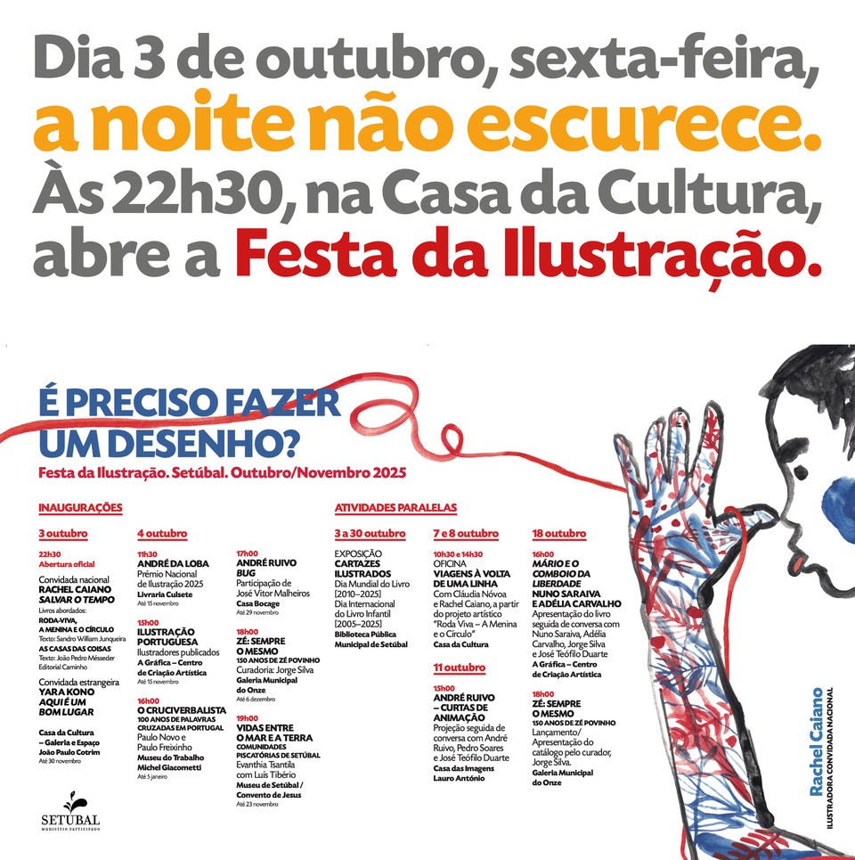 O evento cultural, organizado pela Câmara Municipal de Setúbal com o atelier DDLX, abre a 3 de outubro, às 22h30, na Casa da Cultura, com exposições das ilustradoras Rachel Caiado e Yara Kono, patentes até 30 de novembro.