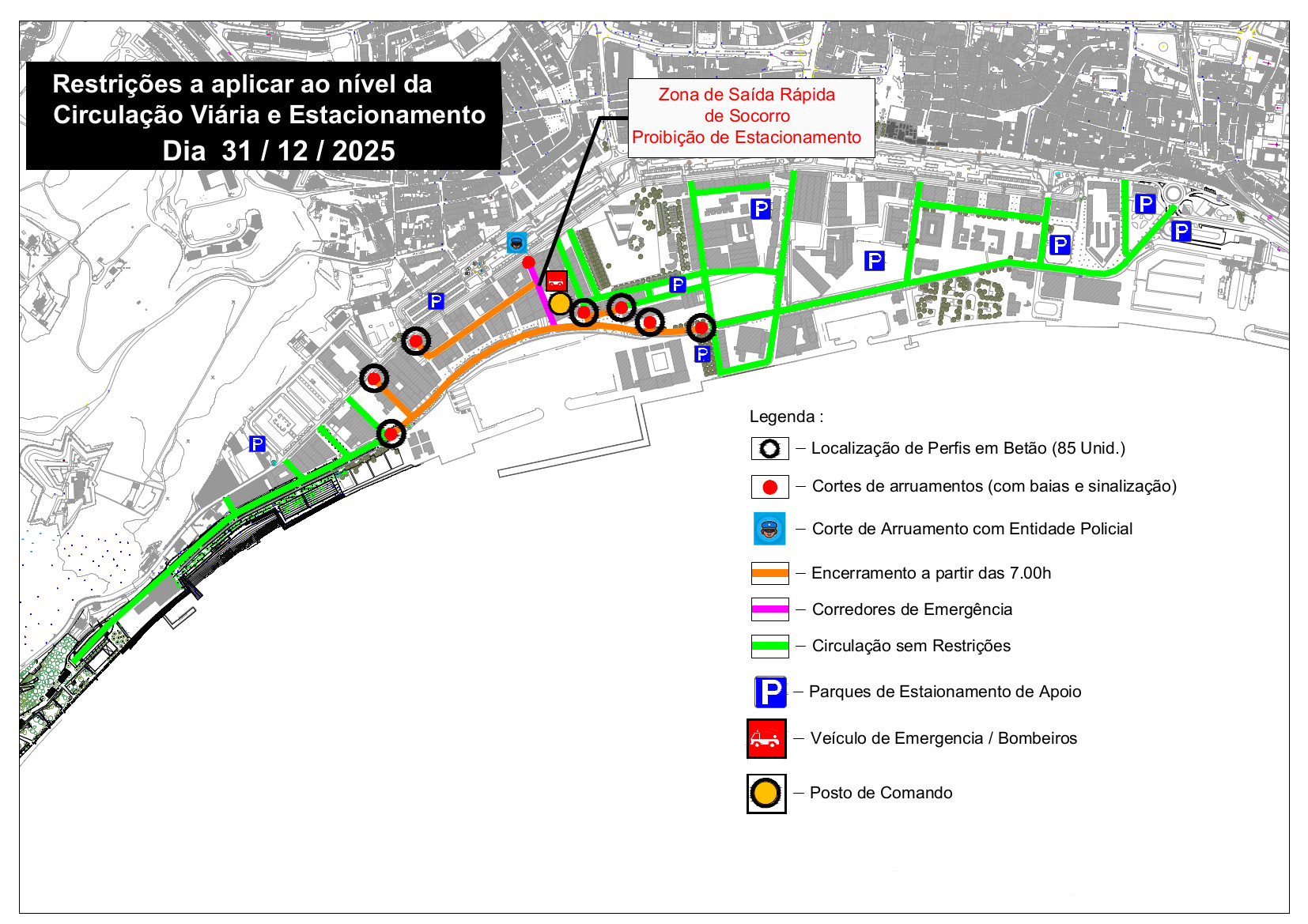 O troço da Avenida José Mourinho compreendido entre a Travessa das Fábricas e a Rua Trabalhadores do Mar, assim como todas as interseções abrangentes estão encerrados à circulação e ao estacionamento automóvel entre as 07h00 de 31 de dezembro e as 03h00 de 1 de janeiro.