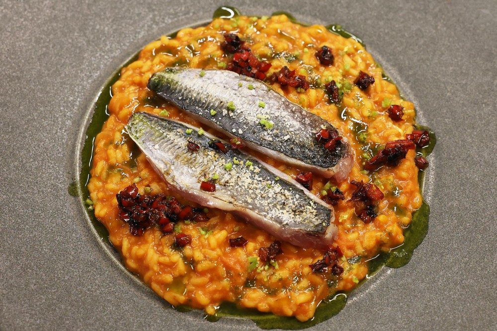 Como prato principal foi servido arroz de tomate com carapau braseado, peixe nutricionalmente rico e sustentável, finalizando com pudim de pão e citrinos, rabanada e praliné de sementes de abóbora.