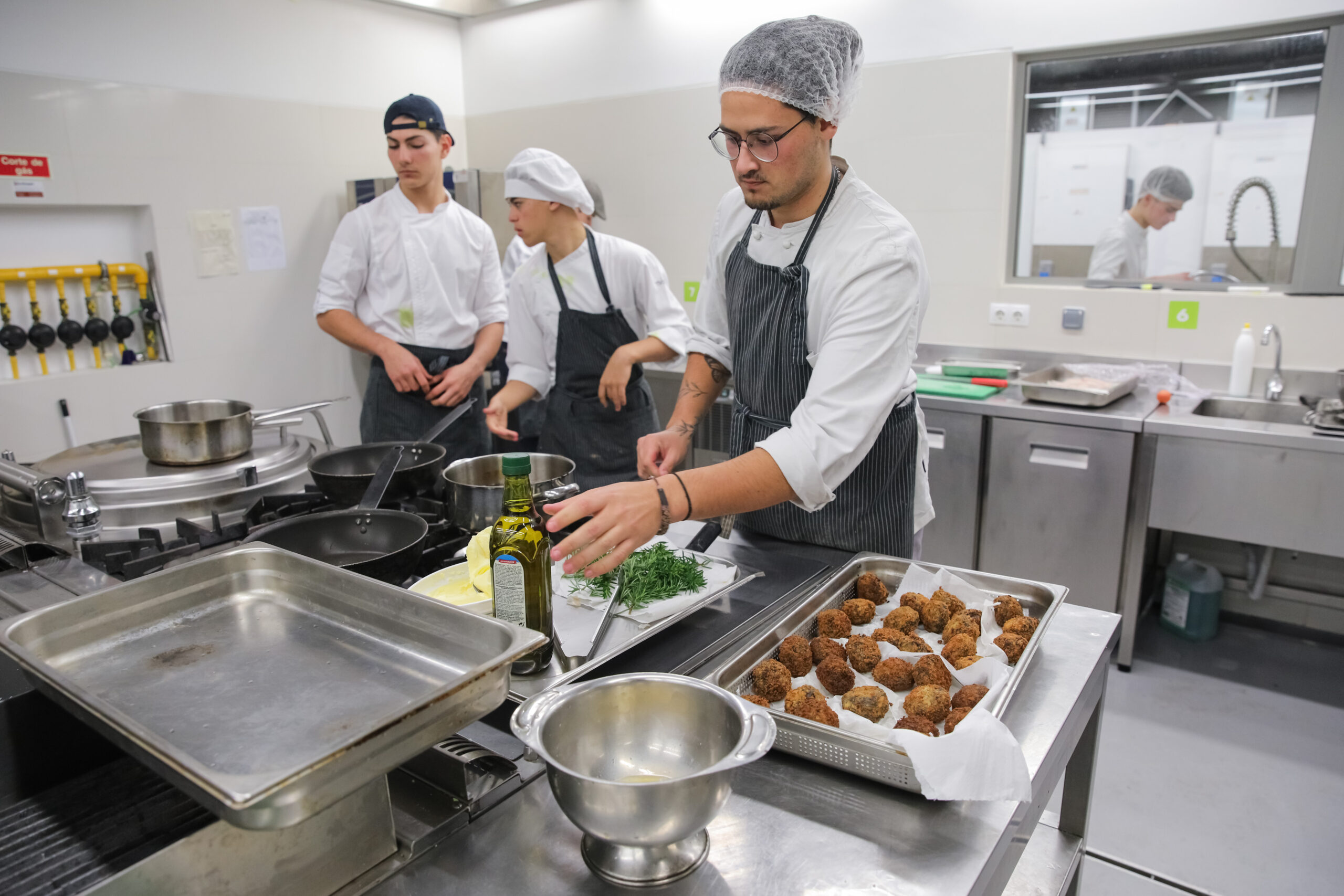 Almôndega de choco em concha de ostra com maionese de alho e ervas, bôla de tomate desidratado, sopa rica de peixe com crouton de alho, robalo com puré de ervilhas e molho beur blanc e, para sobremesa, mil-folhas de arroz-doce com gelado de canela foram as propostas apresentadas pela Escola de Hotelaria e Turismo.