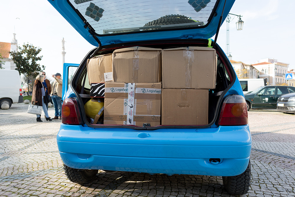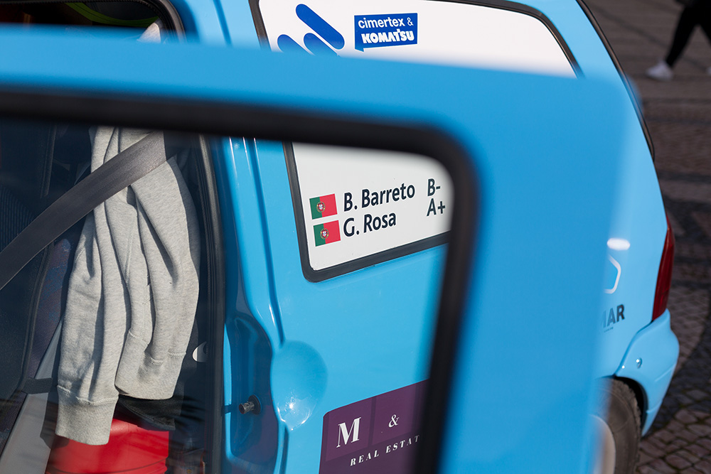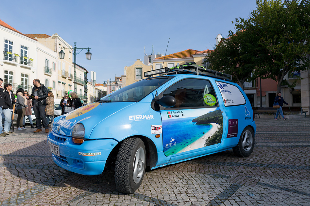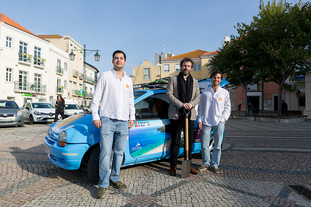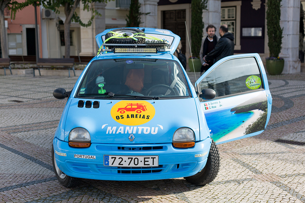 Seguem num Renault Twingo, com 24 anos, devidamente decorado com imagens turísticas de Setúbal, que exaltam a baía e a Arrábida.