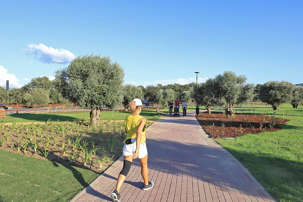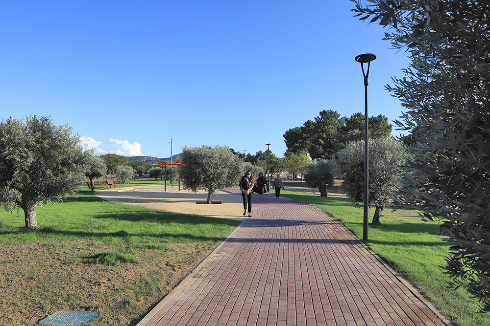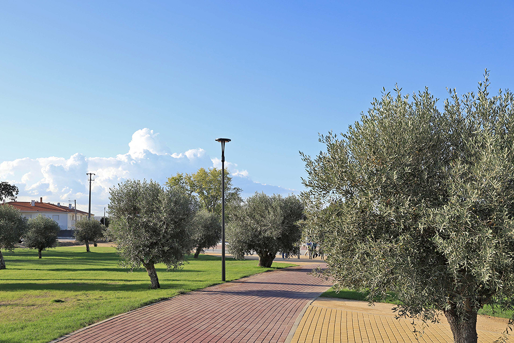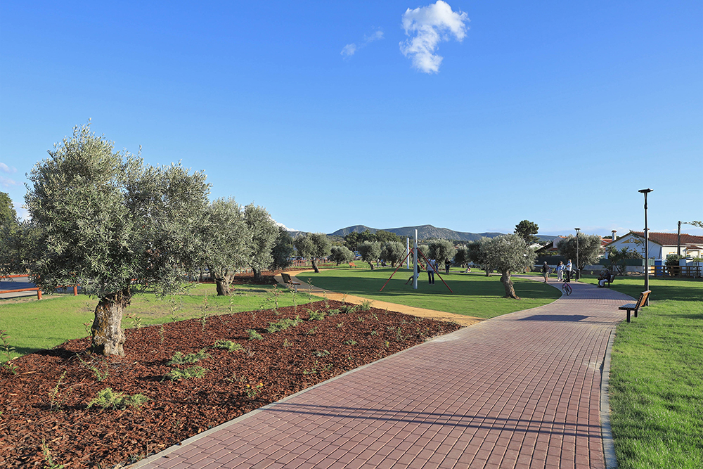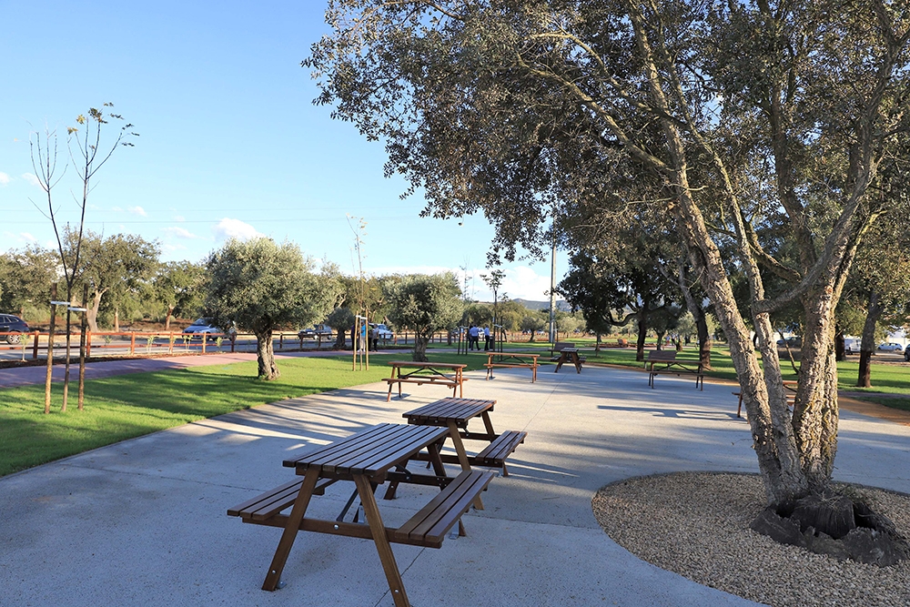 Percursos pedonais pavimentados e em terra compactada ondulantes, numa extensão com cerca de um quilómetro, zonas de estada, áreas ajardinadas com arbustos e árvores, incluindo oliveiras ancestrais, integram o cenário do ampliado parque azeitonense, ladeado a nascente pela Estrada Nacional 10.