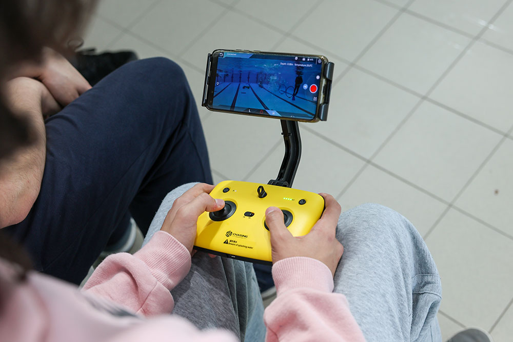 Houve alunos que não quiseram participar no mergulho e ficaram na bancada da Piscina Municipal das Palmeiras a contactar com tecnologia de exploração do mundo subaquático.
