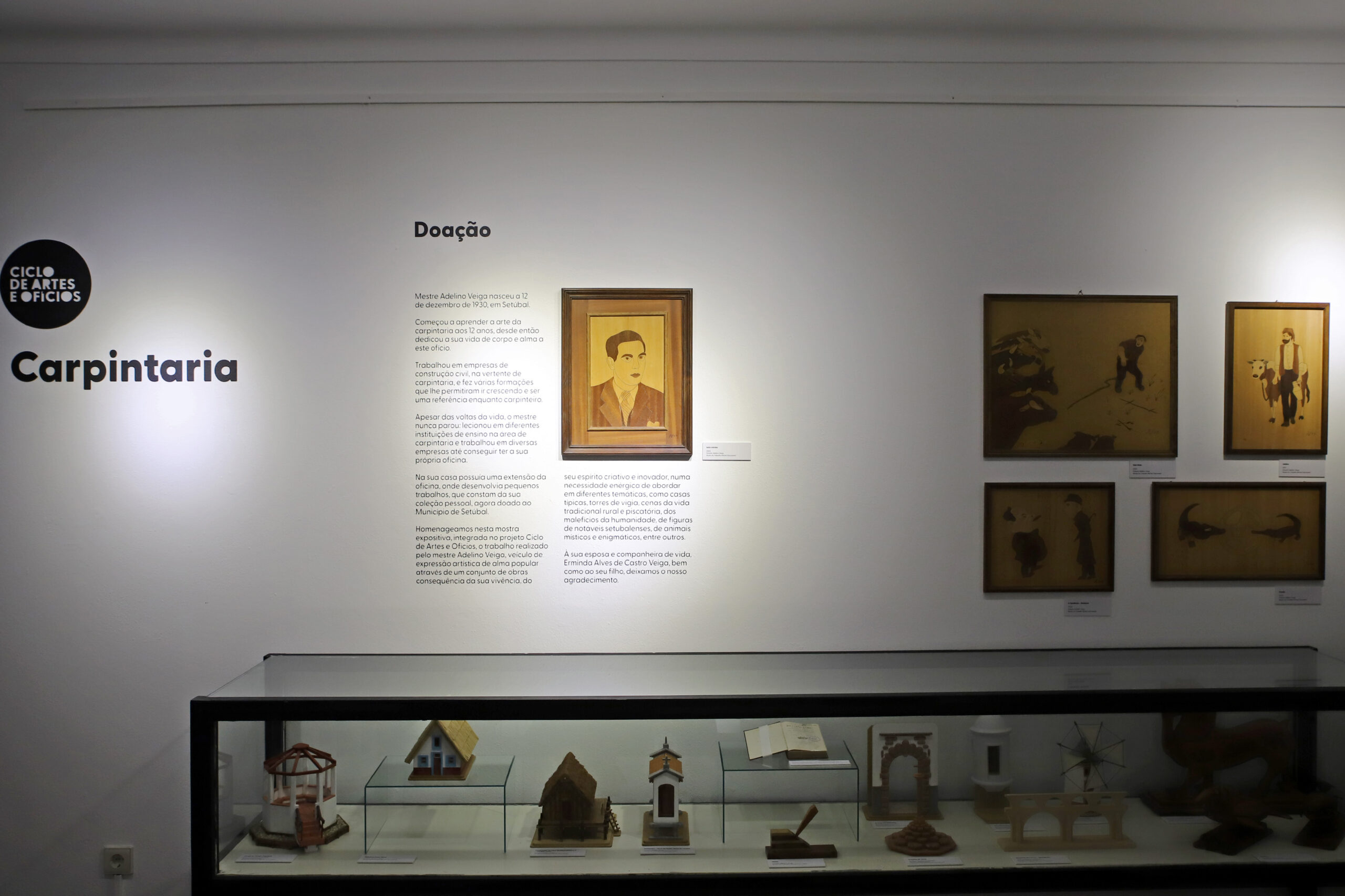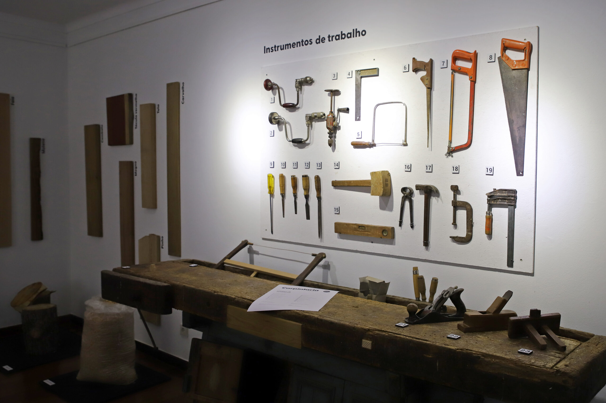 Ferramentas e utensílios de trabalho, amostras de diferentes tipos de madeira e objetos artesanais fazem parte desta exposição que explora o passado, o presente e o futuro da profissão de carpinteiro e que integra parte do espólio que o mestre carpinteiro setubalense Adelino Veiga doou ao município.