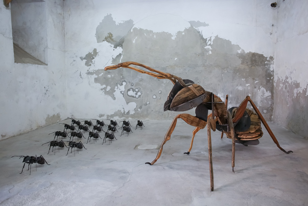 “A interpretação da formiga-rainha ganha força com o cheiro a óleo imbuído. Esta memória remete-nos para a industrialização e para a ordem natural que ali reside – a aglomeração e infestação de formigas que habitam a Gráfica e que foram recordadas pelo artista quando entrou pela primeira vez neste centro de criação artística”, refere Teresa Melo sobre a peça.