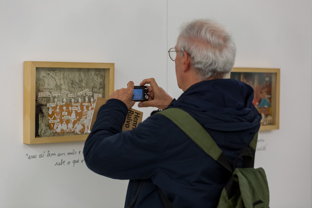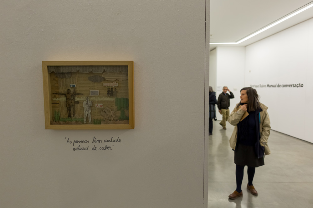“Manual de Conversação Inteligente” intitula a exposição, que reúne duas dezenas de peças de pintura e colagem, emolduradas em caixas, da autoria do artista plástico Henrique Ruivo.
