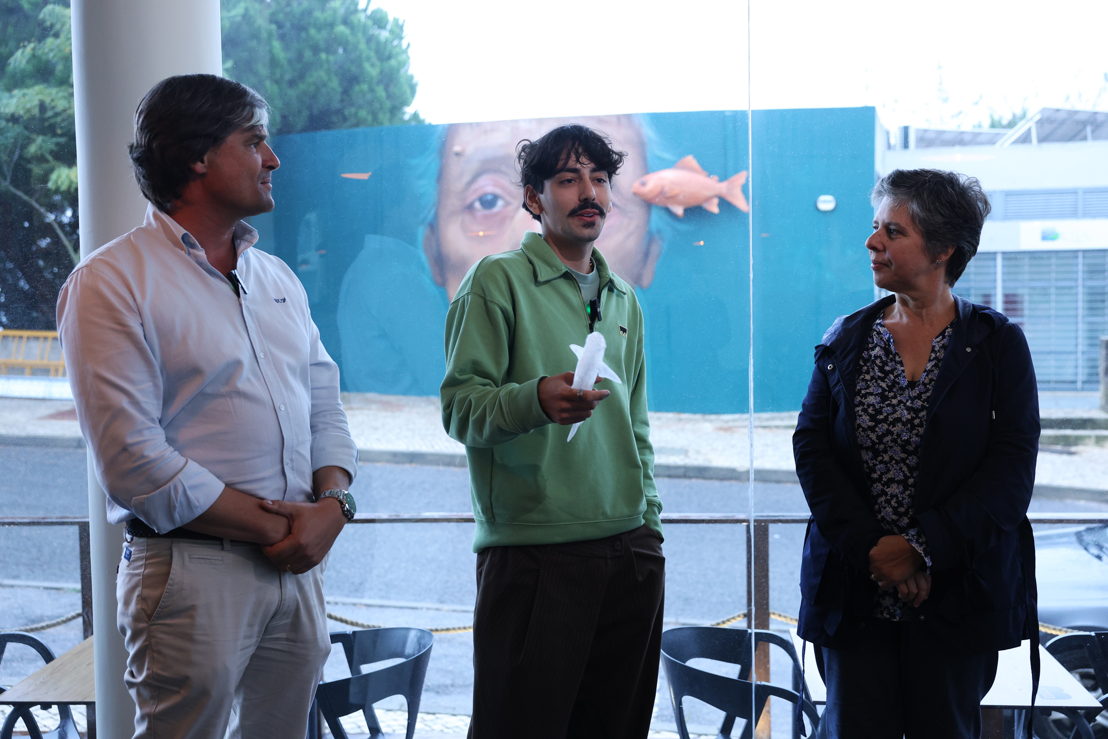 O rosto feminino, de uma pessoa envelhecida, pintado sob uma tela de azul, é expressivo. “Tem a função de juntar as pessoas e o mar e alerta para a necessidade da preservação ambiental”, vincou, para depois aludir ao peixe colocado na parede. “É uma criação formada por vinte peças feitas com base em garrafas de plástico reciclado.”