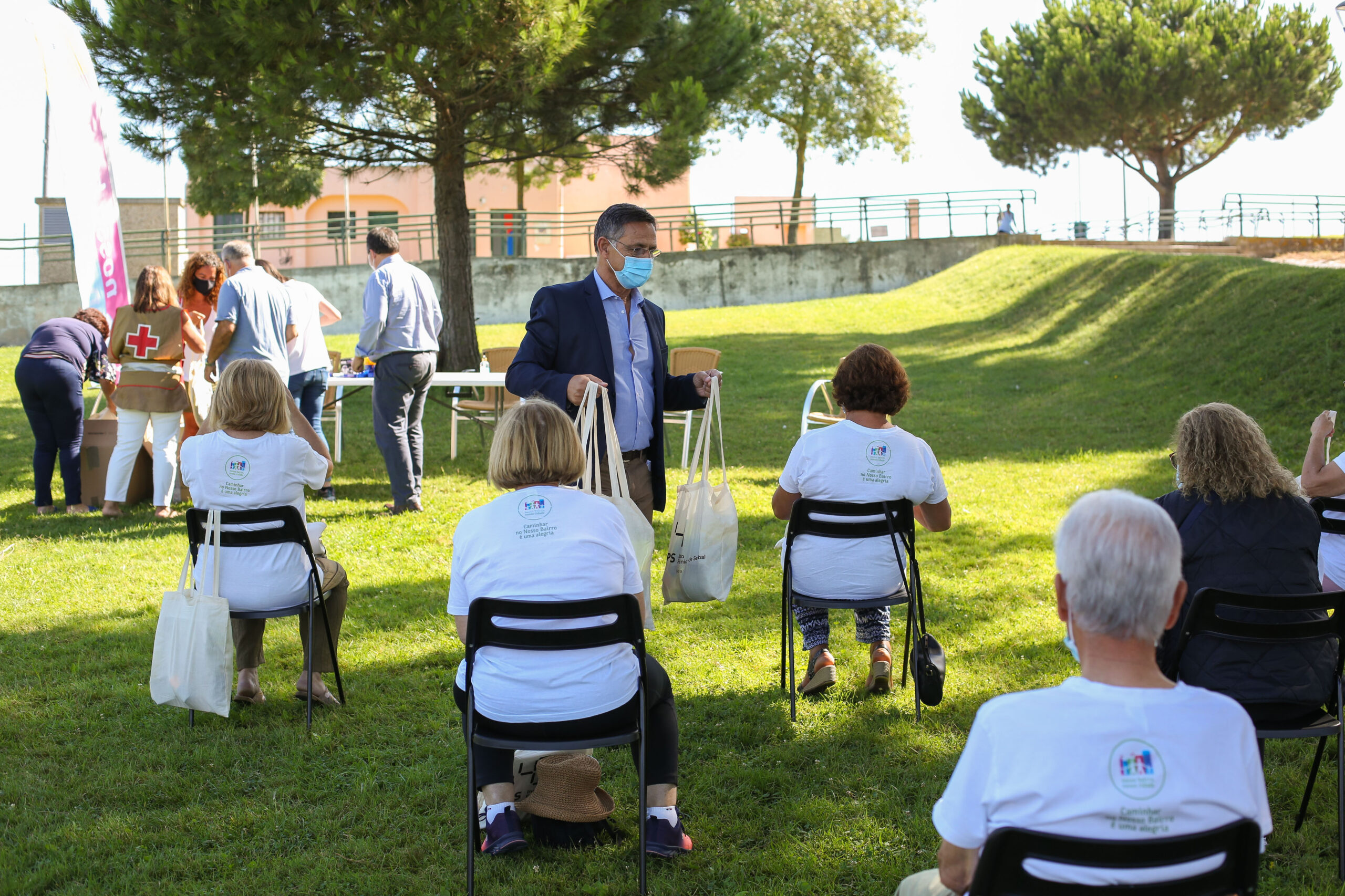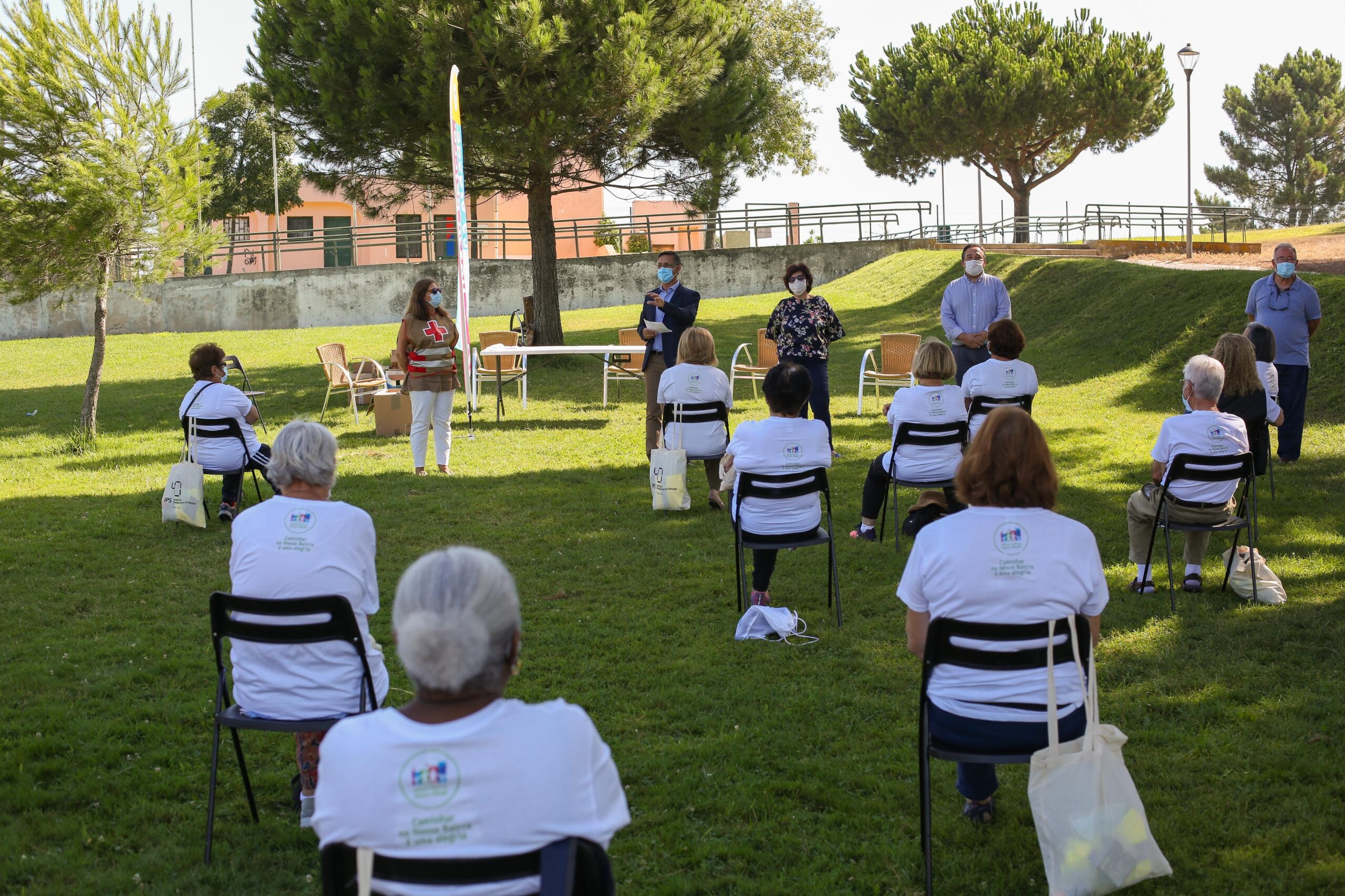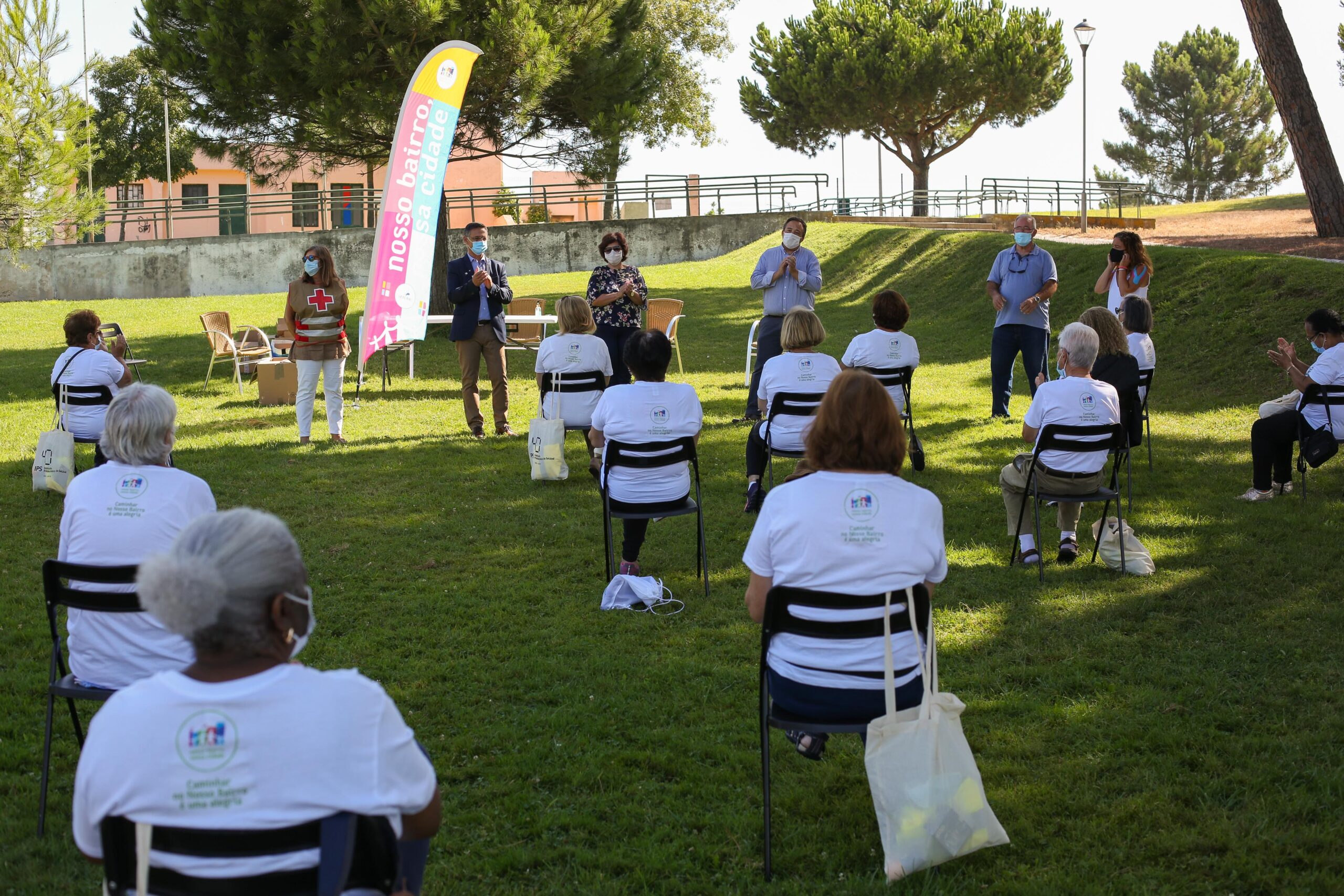 O encontro dos caminhantes no Parque Verde da Bela Vista não foi para os habituais passeios, mas para receberem, através do IPS – Instituto Politécnico de Setúbal, parceiro do projeto, o “Kit Caminhante”, constituído por uma toalha técnica, pensos rápidos, caderno, lápis e caneta para anotação de registos biométricos, uma t-shirt, colete refletor e uma bolsa de transporte.