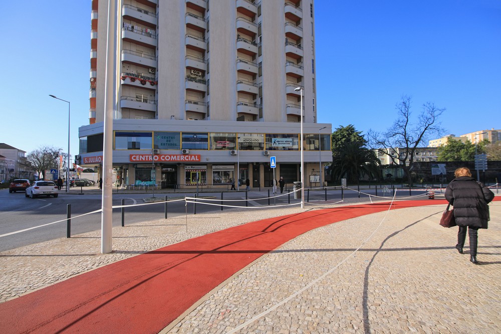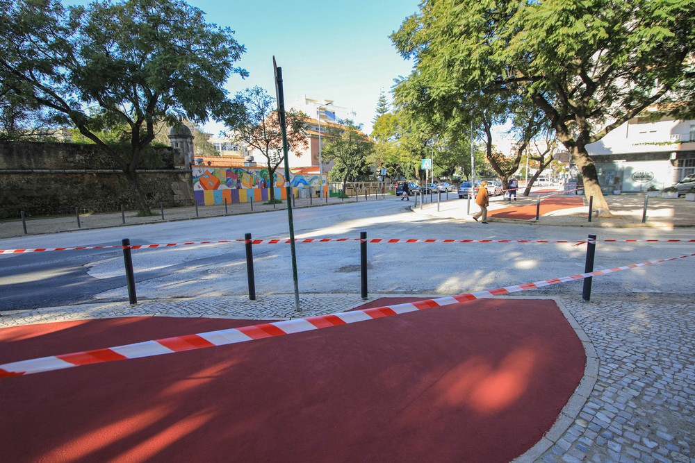 O novo troço de ciclovia na Rua Jorge de Sousa, incluído num amplo projeto de requalificação na zona do Montalvão, que a Câmara Municipal de Setúbal está a concluir, já recebeu a pintura com o revestimento especial.
