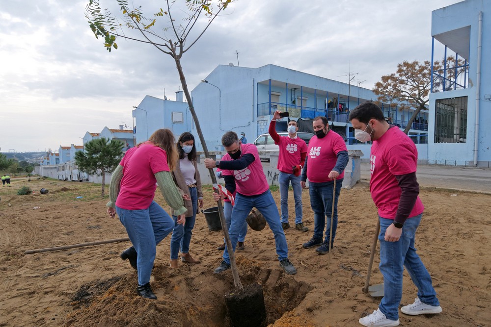 A plantação de 27 árvores, doadas no âmbito do apoio mecenático, envolveu os serviços municipais e seis voluntários do Alegro Setúbal em mais uma fase da criação de um novo espaço verde, numa área de cerca de 4250 metros quadrados na Avenida Belo Horizonte junto da escultura “Autocarro”, de João Limpinho.