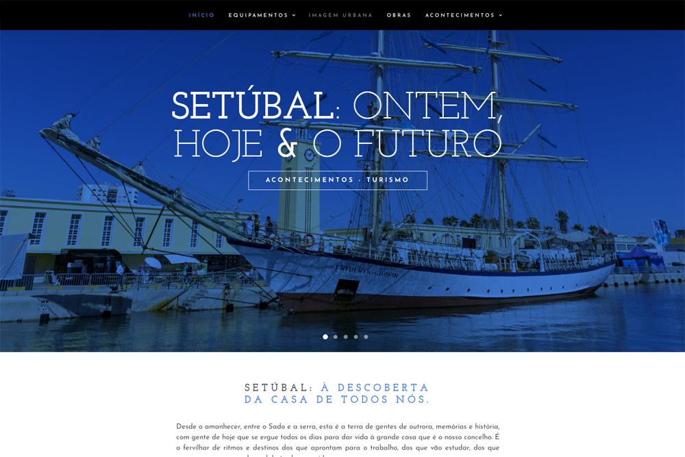No menu Equipamentos estão os estádios de evolução de instalações geridas pela autarquia na área da cultura, desporto, educação, ambiente, economia, turismo, direitos sociais, segurança e juventude, bem como os Paços do Concelho, edifícios Sado e dos Ciprestes e Parque Municipal de Poçoilos.