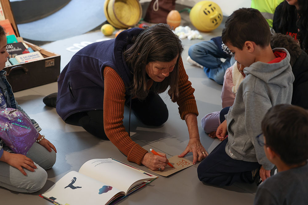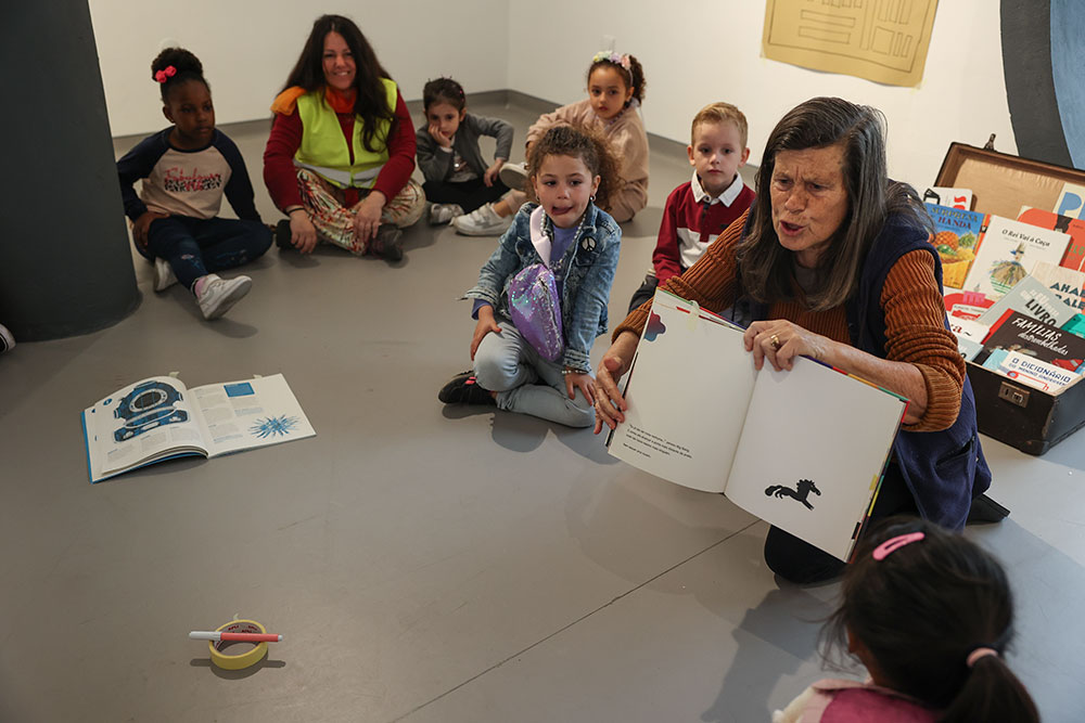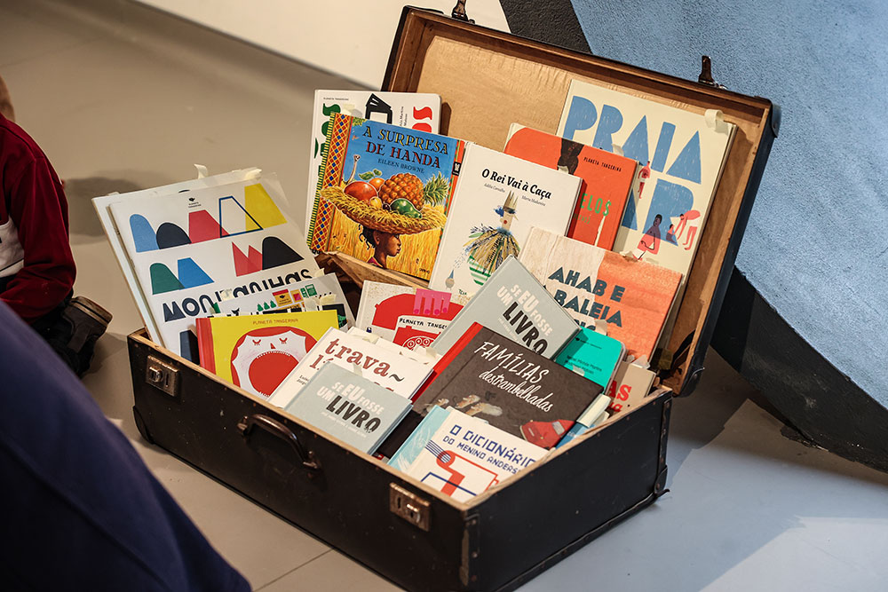 A tarefa do dia foi irem, individualmente, a uma mala de viagens, escolher um livro, folheá-lo, eleger uma imagem, associá-la a uma palavra, escrevê-la num papel e colocá-lo no chão com fita adesiva. No final, têm de produzir ilustrações em folhas brancas, que serão ser agrupadas no “livro das palavras”.