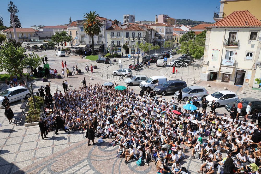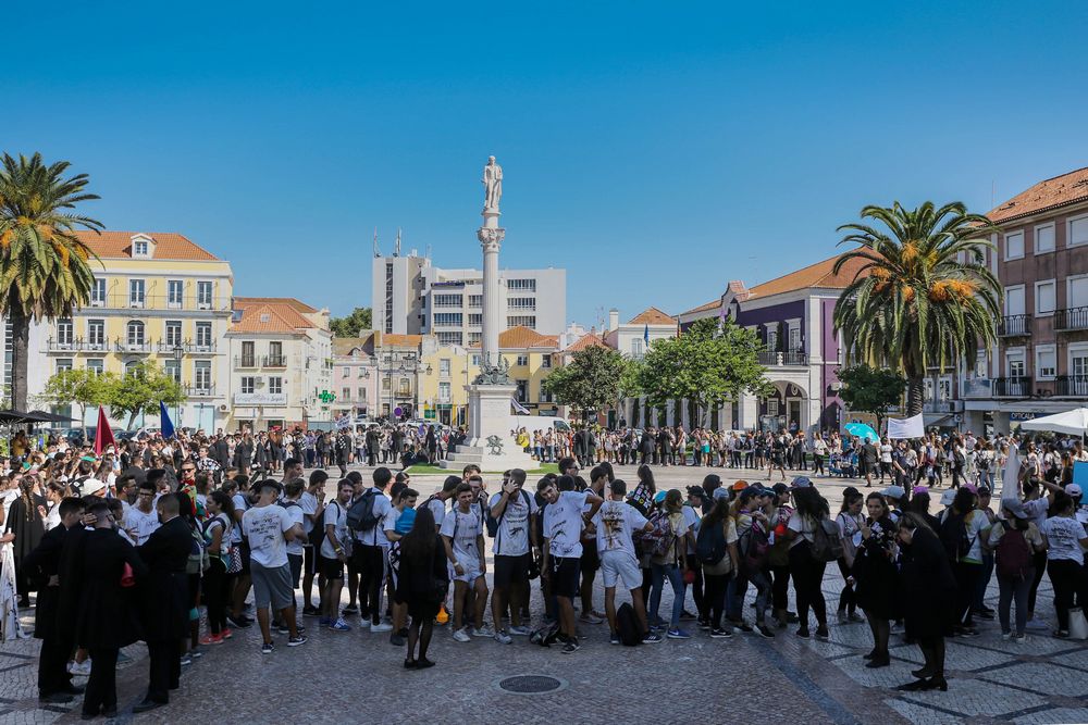 “ESCE, olé!”, ouve-se cantar de um lado da estátua. São as tradicionais cantorias de apoio às escolas do IPS – Instituto Politécnico de Setúbal onde entraram este ano para frequentar licenciaturas de diversas áreas.
