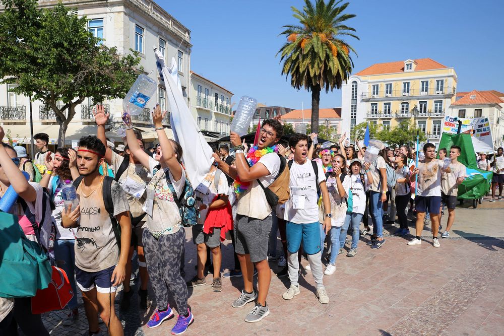 Alguidares de plástico, capacetes de obras e lenços na cabeça ajudam a proteger do sol, enquanto se arrumam da melhor forma e tentam descansar no final de um percurso iniciado às 10h00, no campus do IPS, com uma paragem na Junta de Freguesia de São Sebastião onde um membro do executivo deu as boas-vindas a todos.