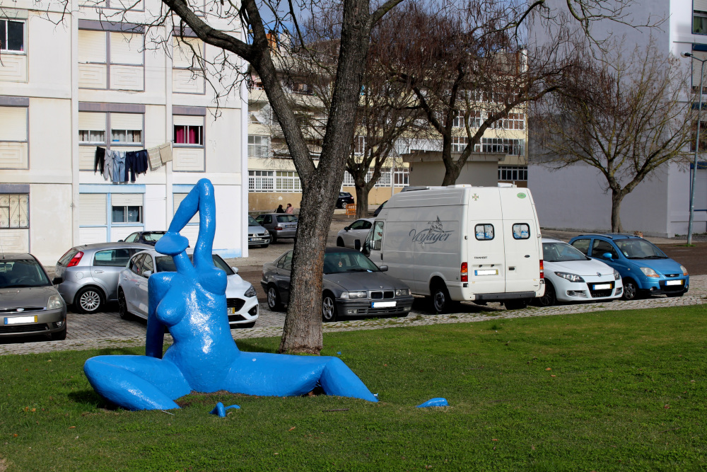 A peça escultórica da “Mulher Azul”, sita no espaço verde entre a Rua Zófimo Ramos Luz e a Avenida Bento de Jesus Caraça, foi integralmente repintada na sua cor original, após ter sido, mais uma vez, alvo de atos de vandalismo.