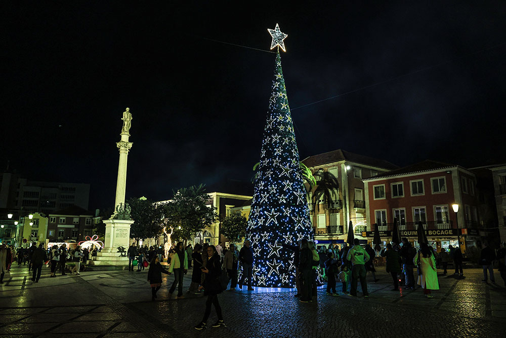 A primeira instalação a acender foi uma grande bola de Natal junto da entrada dos Paços do Concelho, seguida de uma cortina de luzes na varanda do edifício e da árvore gigante que domina a Praça de Bocage.