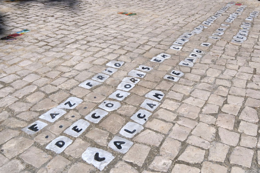 As letras, que formam o verso “Faz frio. De cócoras em linha, os calceteiros calçam de lado a lado a longa rua”, foram pintadas em três dezenas de pedras, colocadas depois na calçada por funcionários municipais.