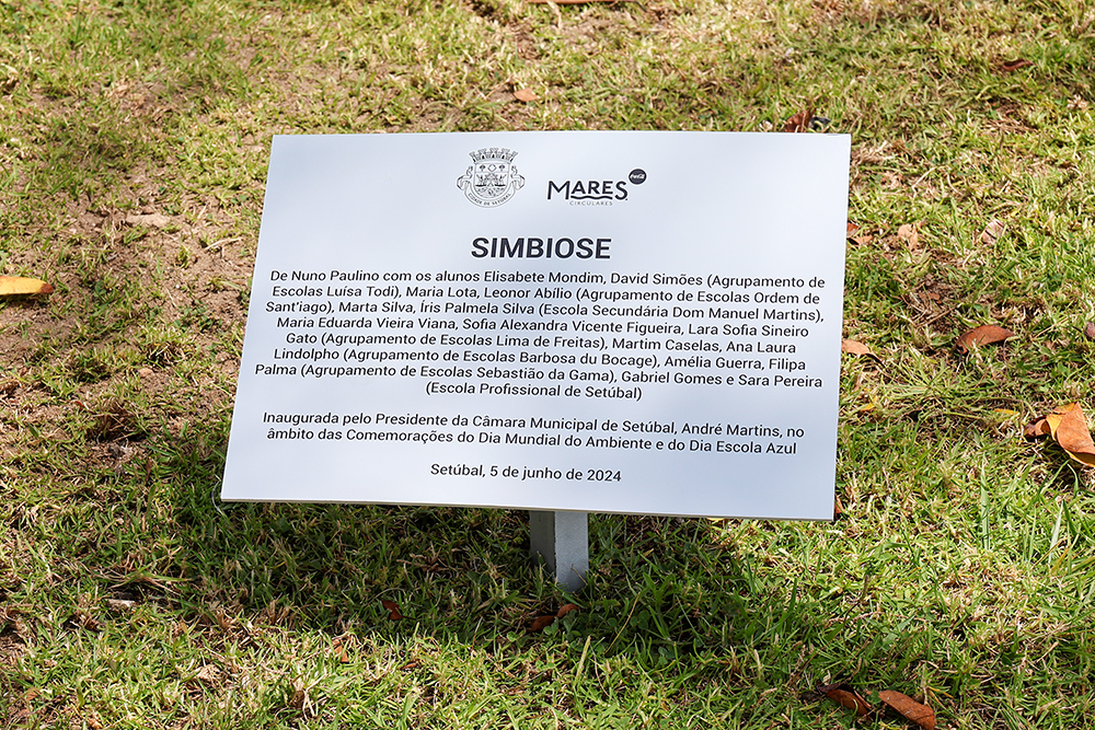 A escultura “Simbiose”, feita a partir de lixo marinho, foi criada para evocar a “relação simbiótica entre cavalos-marinhos e pradarias marinhas” do Estuário do Sado, além de enaltecer a importância da cooperação no processo criativo, uma vez que contou com “o envolvimento de alunos do concelho”, salientou Nuno Paulino, responsável pela peça.