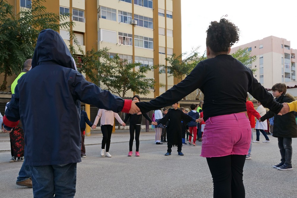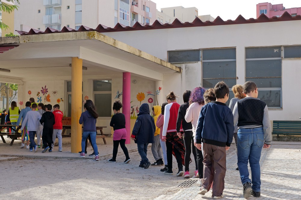 Entretanto, as crianças já saíram da sala e são encaminhadas, ordeiramente e por caminhos previamente estabelecidos, para o campo de jogos da escola, definido no plano de segurança escolar como ponto de encontro em caso de emergência.
